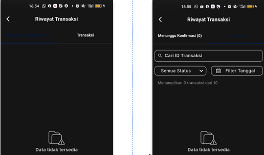 Pada halaman Riwayat Transaksi menampilkan tab menu Menunggu Konfirmasi (default) dan Transaksi.