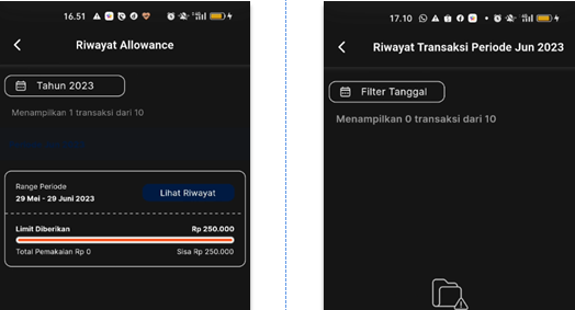 Pada halaman Riwayat Allowance menampilkan riwayat transaksi dari pemberian dan penggunaan Allowance.