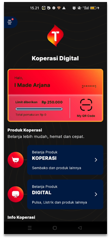 Koperasi Digital dilengkapi dengan aplikasi berbasis Android maupun iOS yang digunakan oleh anggota untuk melakukan transaksi baik Produk Digital maupun Produk Fisik. Di bawah adalah tampilan halaman utama dari aplikasi: