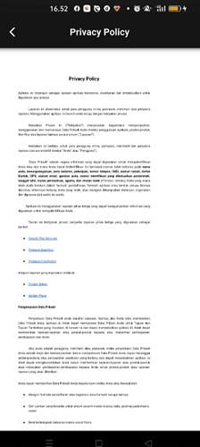 Pada halaman Privacy Policy berisi pernyataan hukum yang menjelaskan bagaimana koperasi mengumpulkan, memproses menangani, dan menghormati data pribadi pelanggannya di aplikasi.
