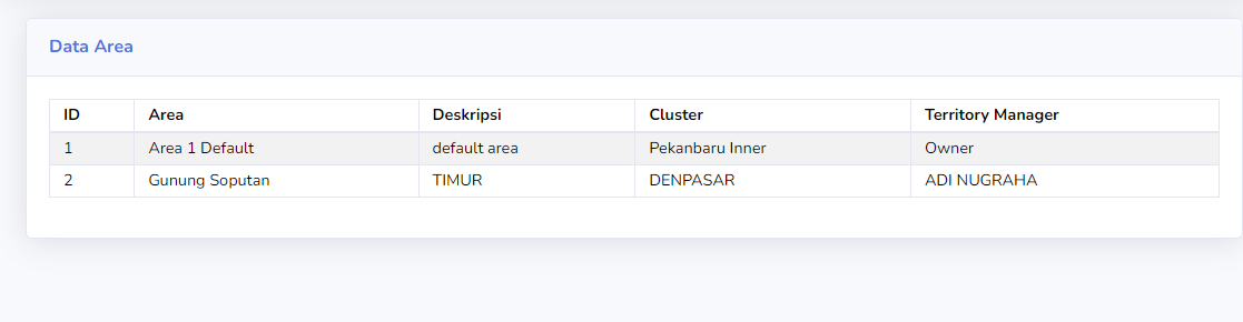 Pada menu ini akan menampilkan daftar area, cluster, dan territory manager yang menangani area tersebut.