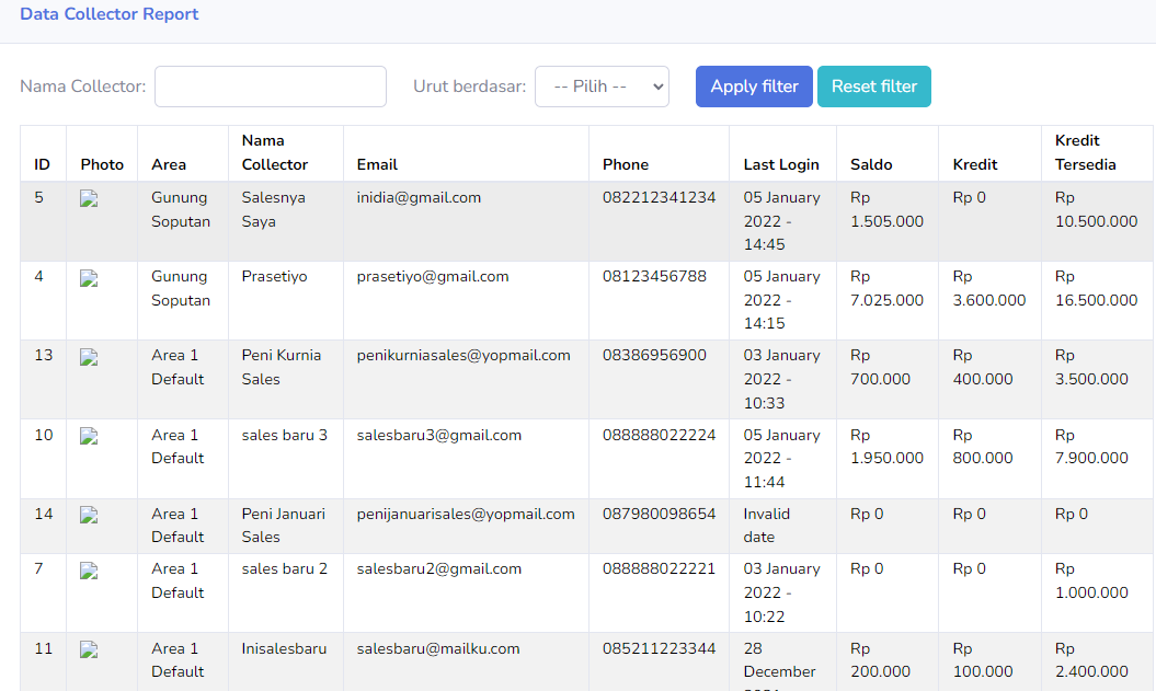 Pada menu ini Territory Manager bisa memantau data dari masing-masing collector berdasarkan area, nama collector, jumlah saldo, kredit dan kredit tersedia colector tersebut.