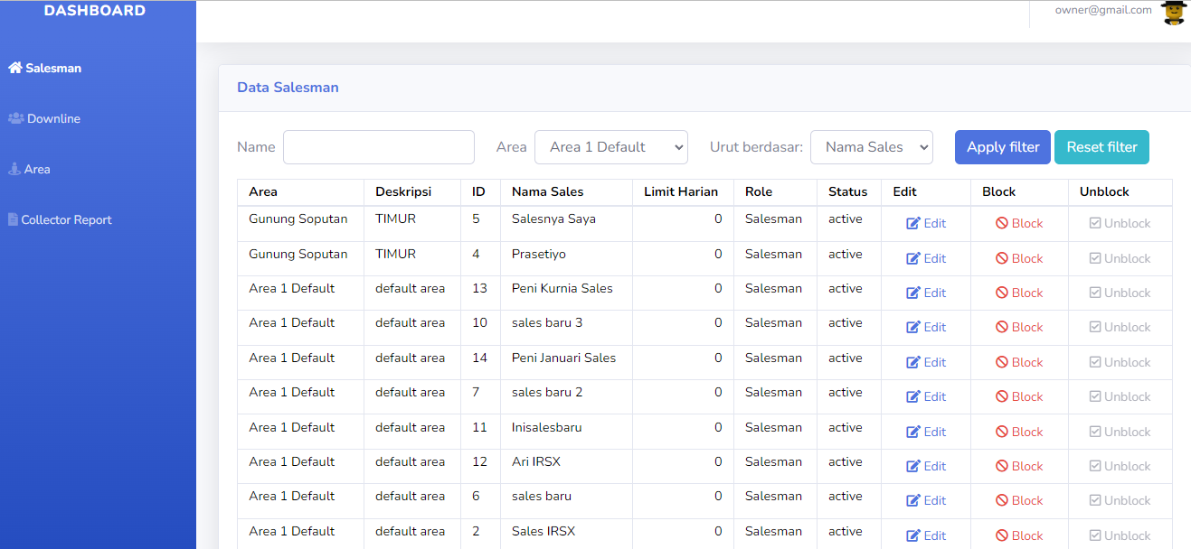 Mini Dashboard Salesman ini dibuat untuk memudahkan Territory Manager untuk mengatur limit harian sales, memantau data jumlah kredit tersedia downline, jumlah saldo kolektor, kredit dan kredit tersedia kolektor. dan pada web ini terdapat beberapa menu yaitu: Menu Salesman, Downline, Area dan Collector Report.