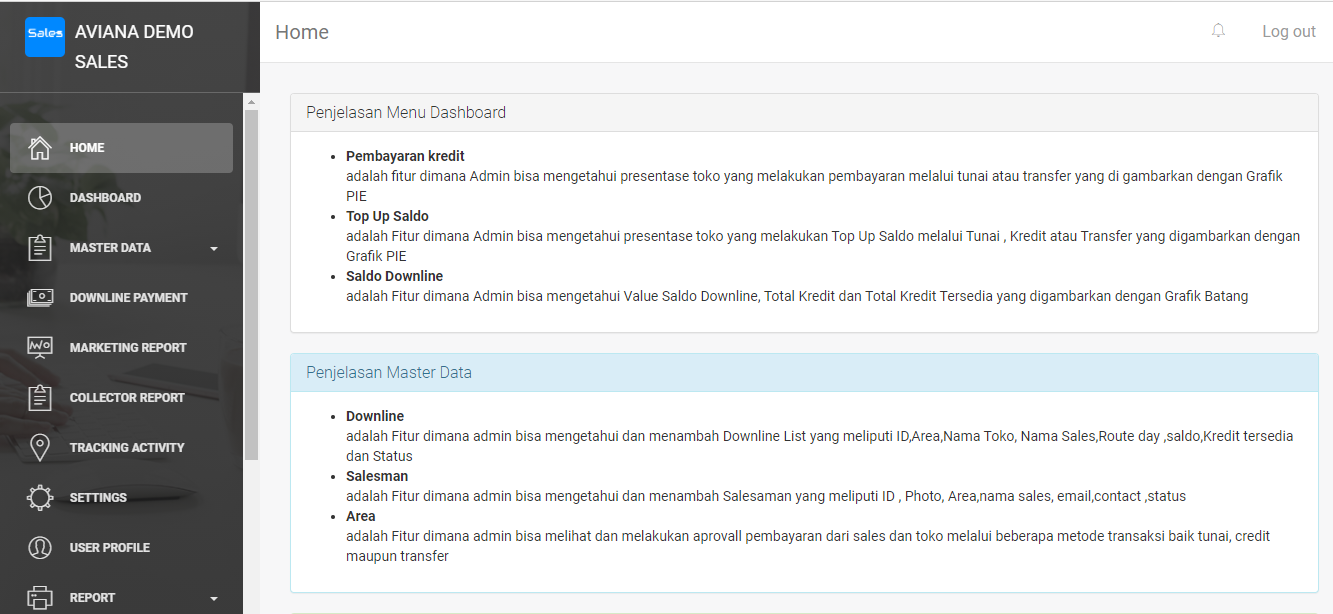 Pada menu home akan menampilkan penjelasan singkat tentang menu-menu yang terdapat pada web salesman seperti : penjelasan tentang menu dashboard, menu master data, menu downline payment, menu tracking activity, menu settings, dan menu user profile.