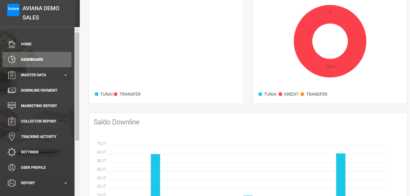 Menu dashbord memiliki fungsi untuk menampilkan pembayaran kredit, top up saldo, dan saldo downline yang digambarkan dengan grafik pie dan grafik batang. Adapun fitur-fitur yang terdapat pada menu dashbord beserta fungsinya pada slide selanjutnya.
