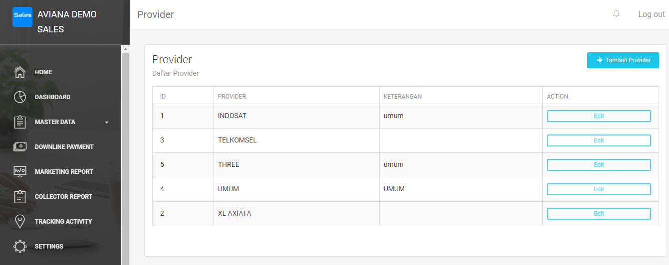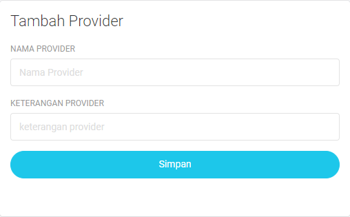 pada menu ini akan menampilkan input provider yang menjadi rekanan dan admin dapat menambahkan data provider baru pada menu tambah ataupun mengedit data provider pada menu edit, sebagai berikut: