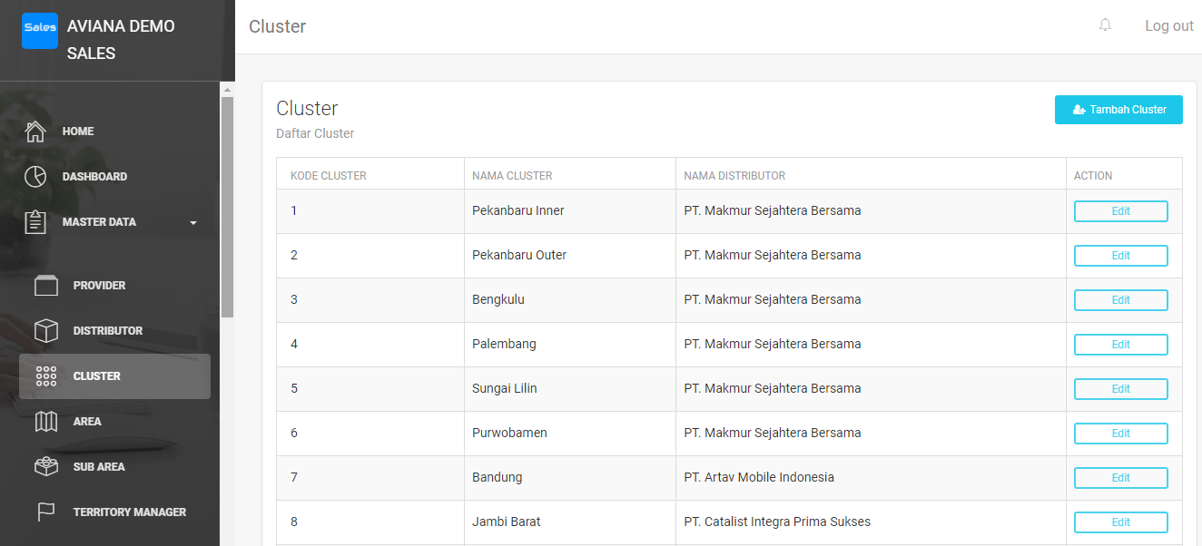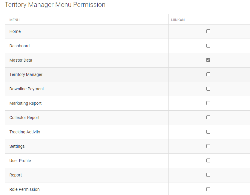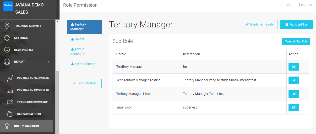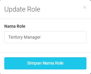 Menu ini berfungsi dimana admin dapat memberikan hak akses untuk masing-masing pengguna seperti territory manager, owner, salesman, admin cluster. dan berikut penambahan role baru: