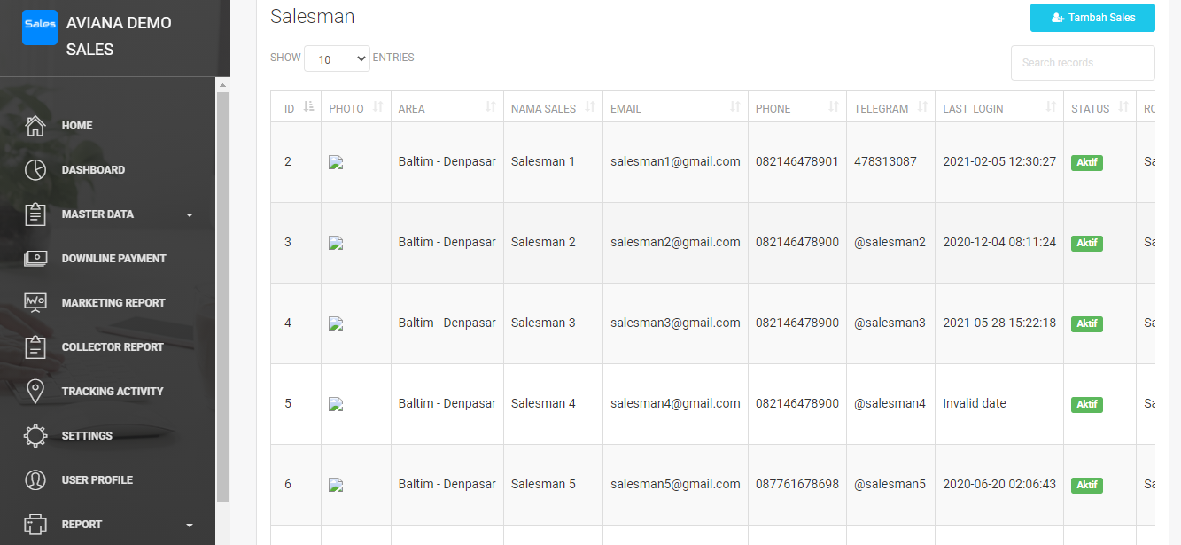 Menu salesman adalah menu dimana admin dapat menambah salesman, mengubah atau mengedit data salesman sebelumnya. Selain itu pada menu ini akan menampilkan daftar nama-nama salesman beserta ID, Area, Nama sales, Email, Phone, ID Telegram, Last login, Status, Role, dan Action.
