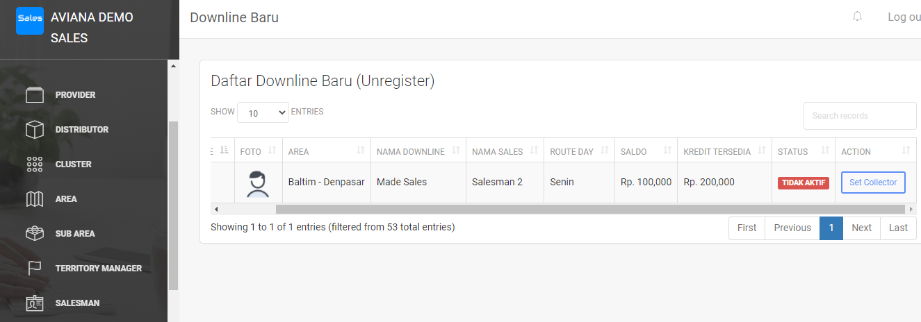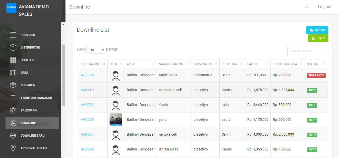 Menu downline adalah menu dimana admin dapat memantau data downline baru. Selain itu pada menu ini akan menampilkan daftar nama-nama downline beserta ID downline, Area, Nama sales, Route day, Saldo, Saldo tersedia, dan status downline dan action tersebut.
