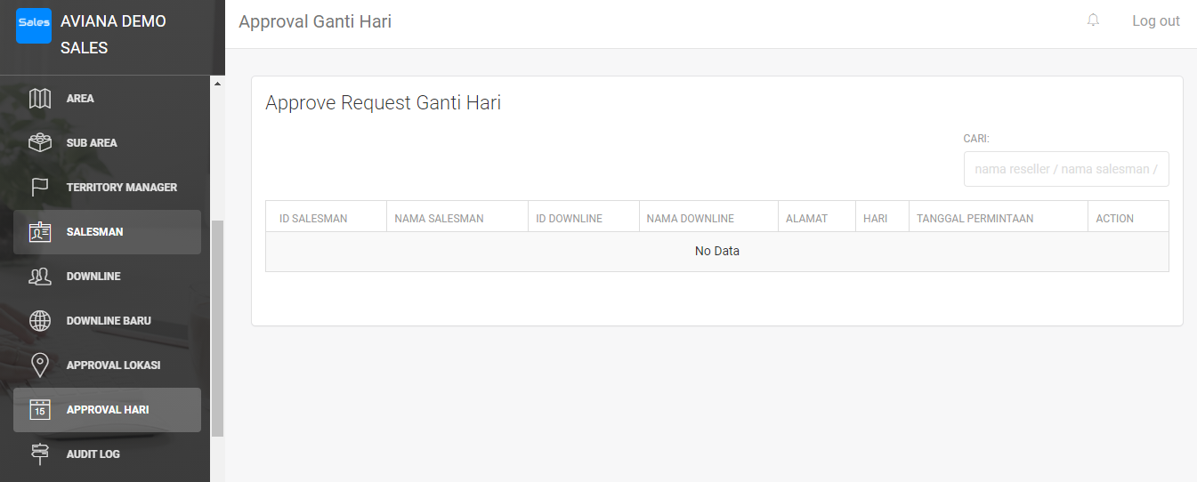 Menu approval hari adalah menu dimana admin dapat memantau daftar nama salesman yang menginginkan mengganti hari kunjungannya ke downline.