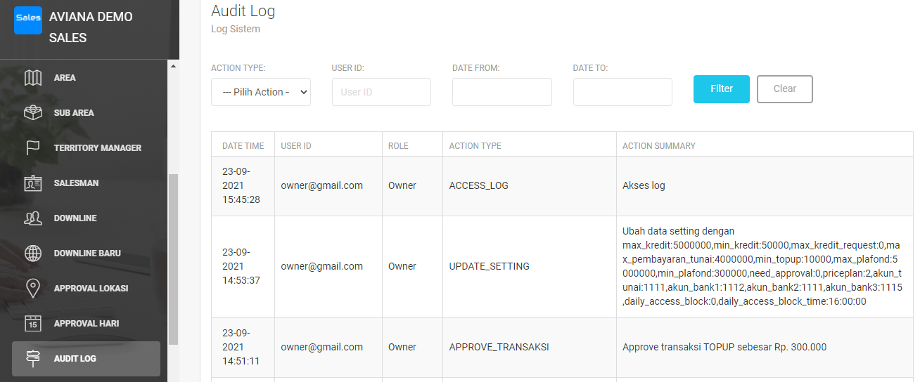 Menu audit log adalah menu yang akan menampilkan history action yang dilakukan oleh admin atau owner yaitu action type, action summary, role, user id, dan date time.