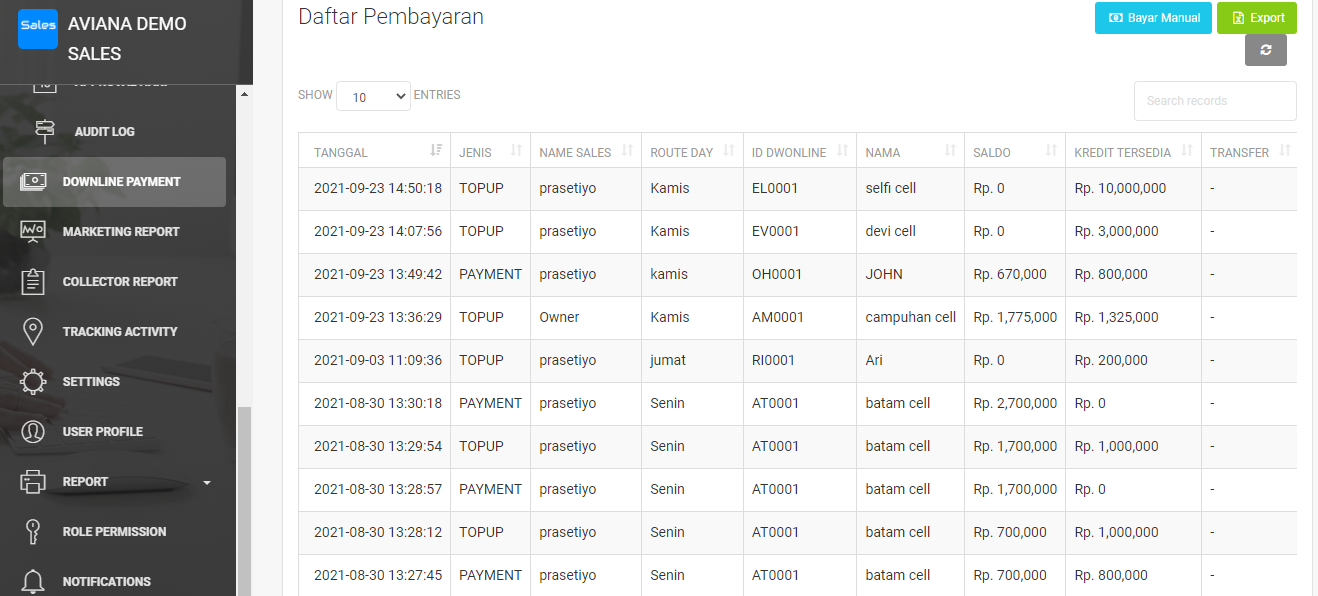 Menu downline payment adalah menu dimana admin dapat mengetahui dan melakukan aprovall pembayaran dari sales dan toko yang melalui beberapa metode transaksi pembayaran seperti: tunai, kredit maupun transfer.
