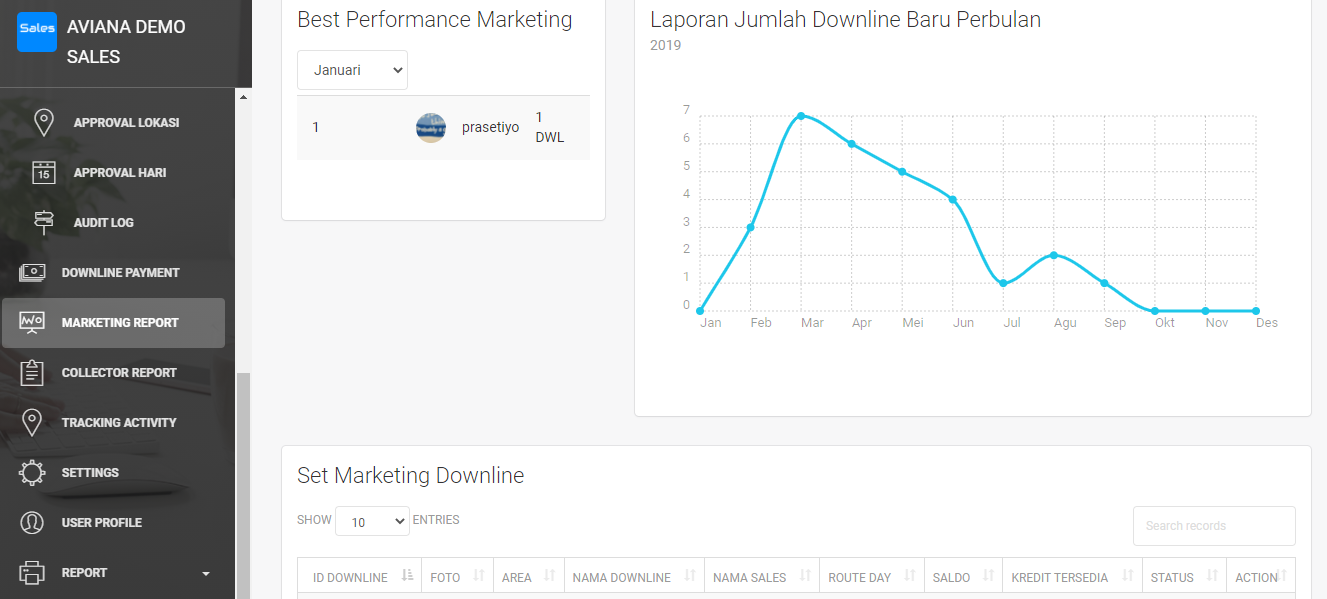 Menu ini akan menampilkan laporan kinerja dari masing-masing marketing, seperti: best performance marketing, jumlah downline baru dari masing-masing marketing yang digambarkan dengan grafik dan set marketing downline.