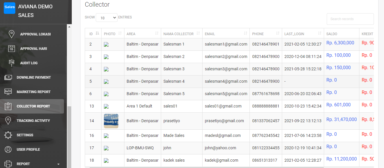 Menu collector report berfungsi untuk menampilkan laporan dari masing-masing colector yang menangani area tertentu. Selain itu pada menu ini juga menampilkan ID, Area, Nama collector, email, nomer handphone, Saldo, kredit, dan kredit tersedia dari masing-masing collector.