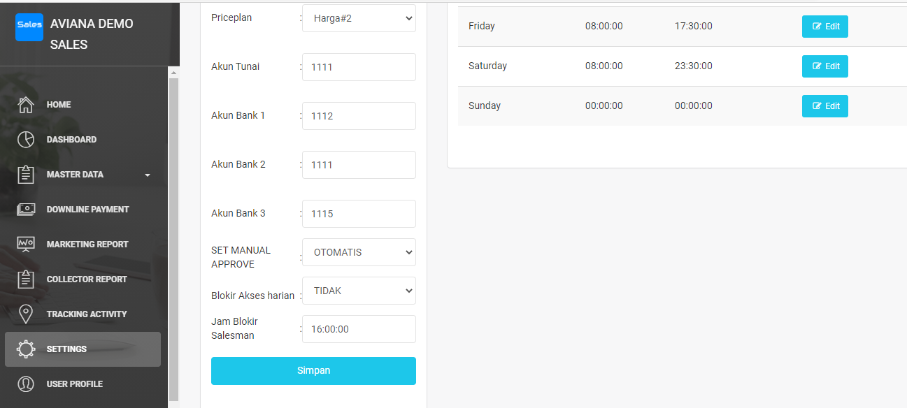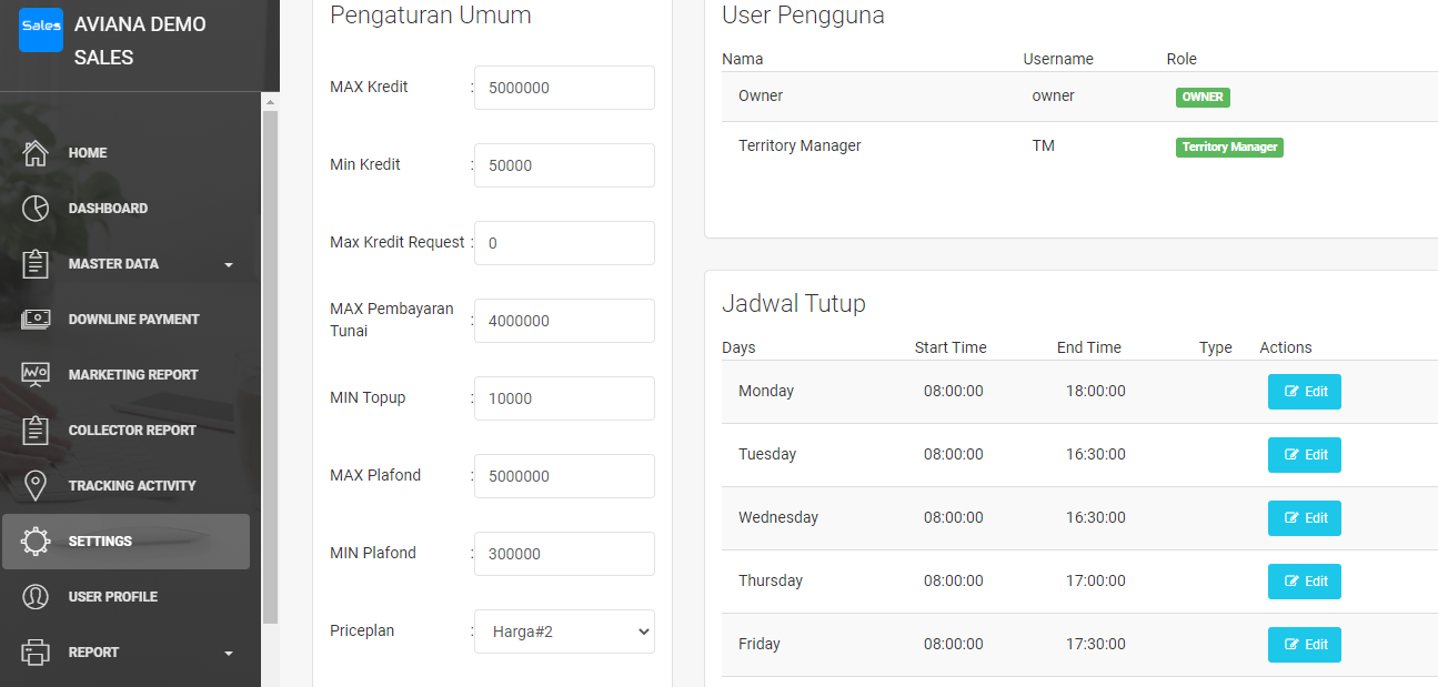 Menu setting adalah menu dimana admin dapat mengatur maximal kredit, minimal kredit, maximal pembayaran, top up dan plafon ke toko sesuai dengan kebijakan perusahaan pada pengaturan umum. Selain itu admin juga dapat mengatur user pengguna, jam buka dan jadwal tutup.