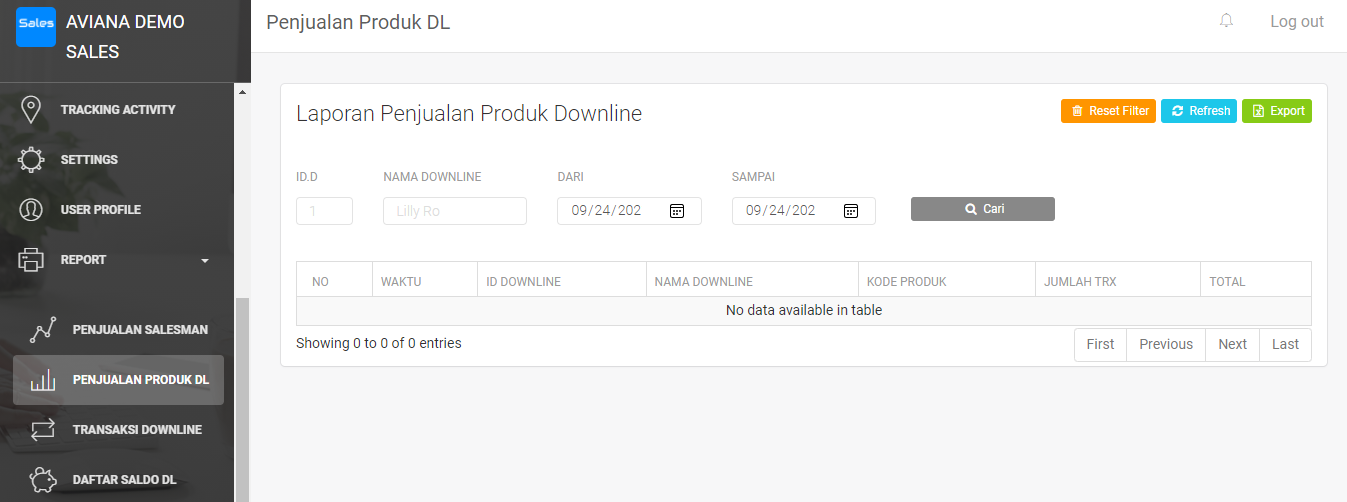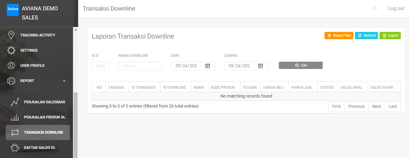 Menu laporan transaksi downline akan menampilkan laporan transaksi downline