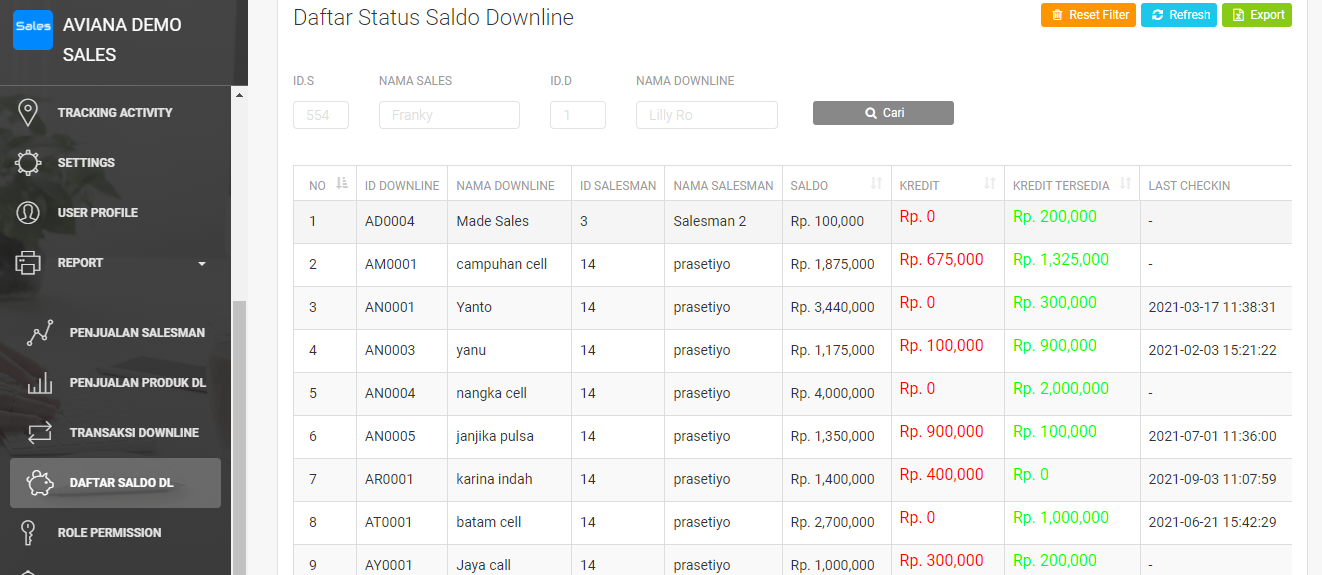 - Saldo Downline adalah menu dimana admin bisa mengetahui total keseluruhan saldo downline yang dibina oleh salesman.