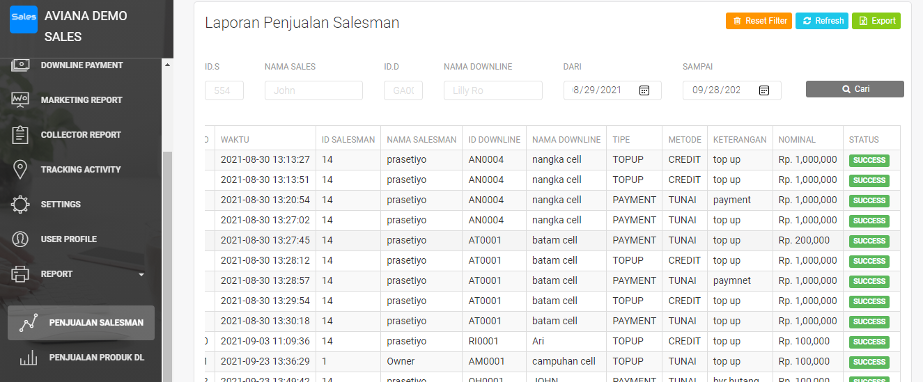 Pada menu ini akan menampilkan laporan penjualan salesman . data yang ditampilkan bedasarkan waktu, id salesman, nama salesman, id downline, nama downline, tipe transaksi, metode pembayaran, keterangan, nominal maupun status transaksi.