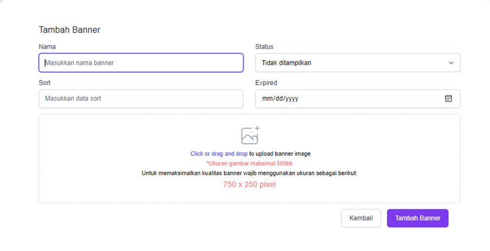 • Pilih “Tambah banner”, isi kolom tambah banner dan upload foto banner yang ingin ditampilkan