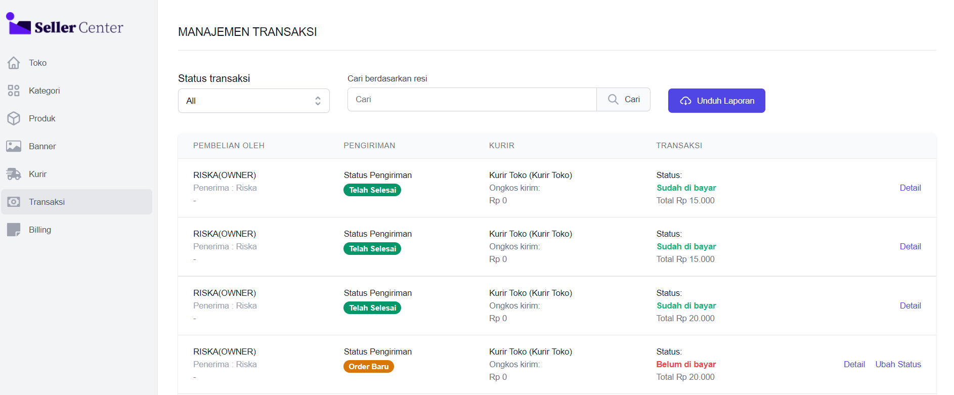 - Transaksi : Status pembayaran sudah dibayar atau belum dibayar