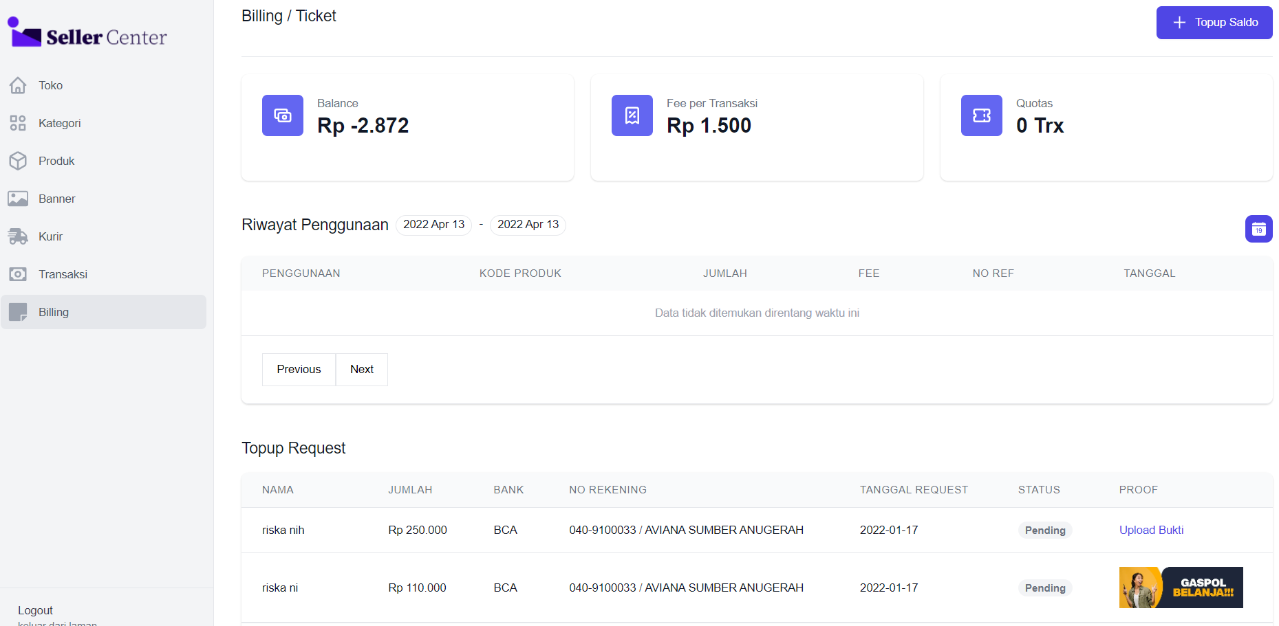 Menu Billing kita dapat melakukan top up saldo fee admin yang akan terpotong saat terjadi transaksi antara pembeli dan penjual.
