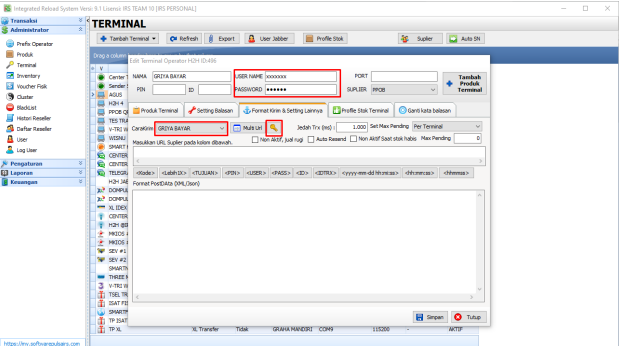 2. Buat terminal Host to Host, seperti gambar dibawah ini, username, password diisi dengan username dan password untuk login aplikasi GRIYA BAYAR, cara kirim pakai GRIYA BAYAR.