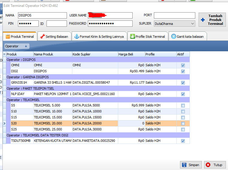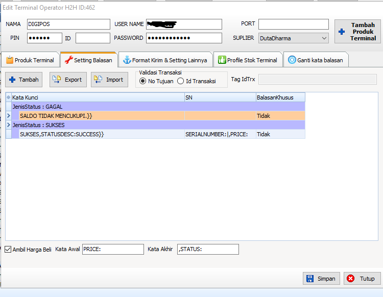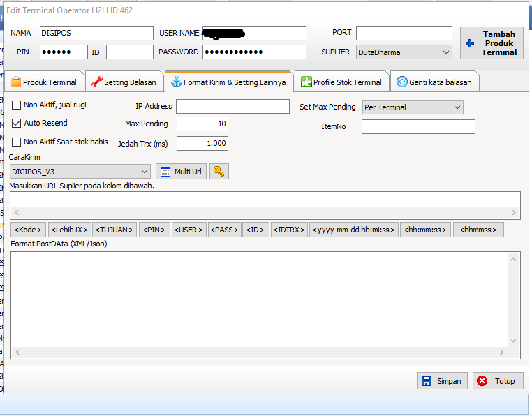 - Isi nama terminal, username password dan Pin transaksi sesuai dengan credential dari akun digiposnya.
